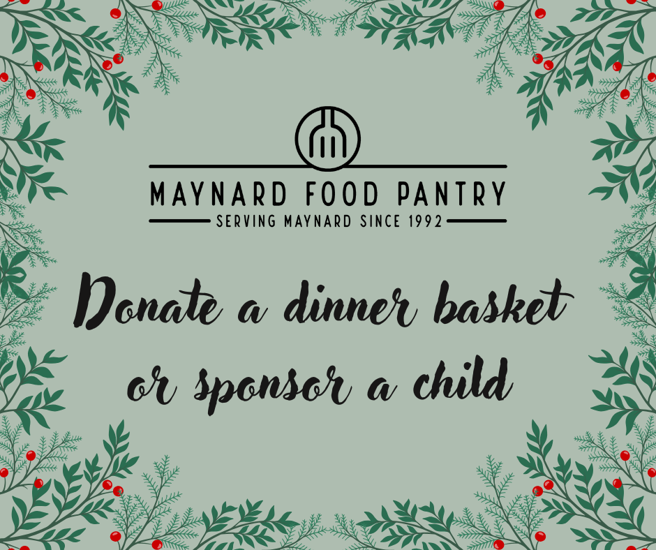Please consider sending a donation of any amount to Maynard Food Pantry, PO Box 55, Maynard, MA 01754. As we begin our 33rd year, the Maynard Food Pantry is very grateful for the outpouring of support we receive from residents, businesses and organizations in Maynard and beyond! Thank you and enjoy your Holidays!